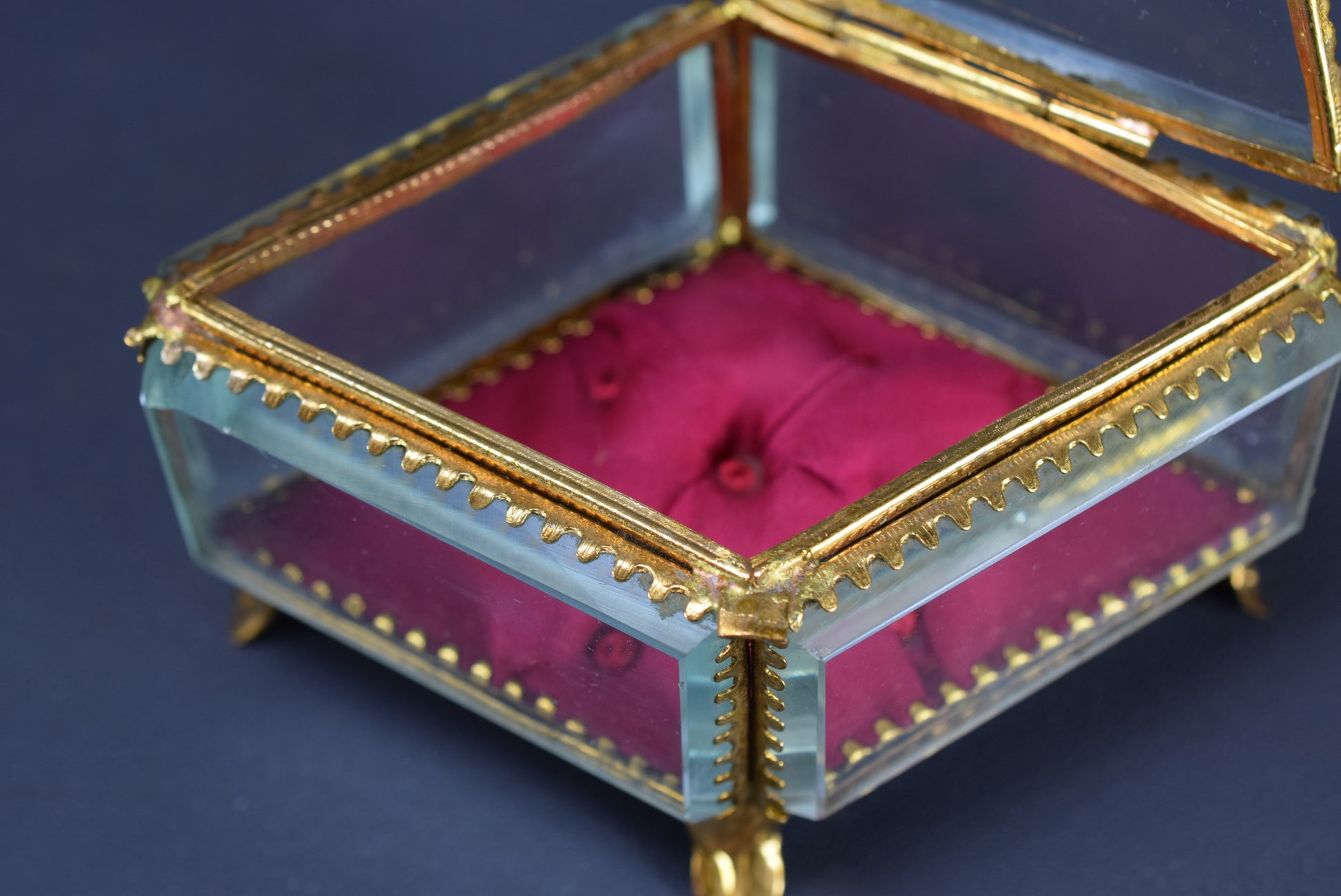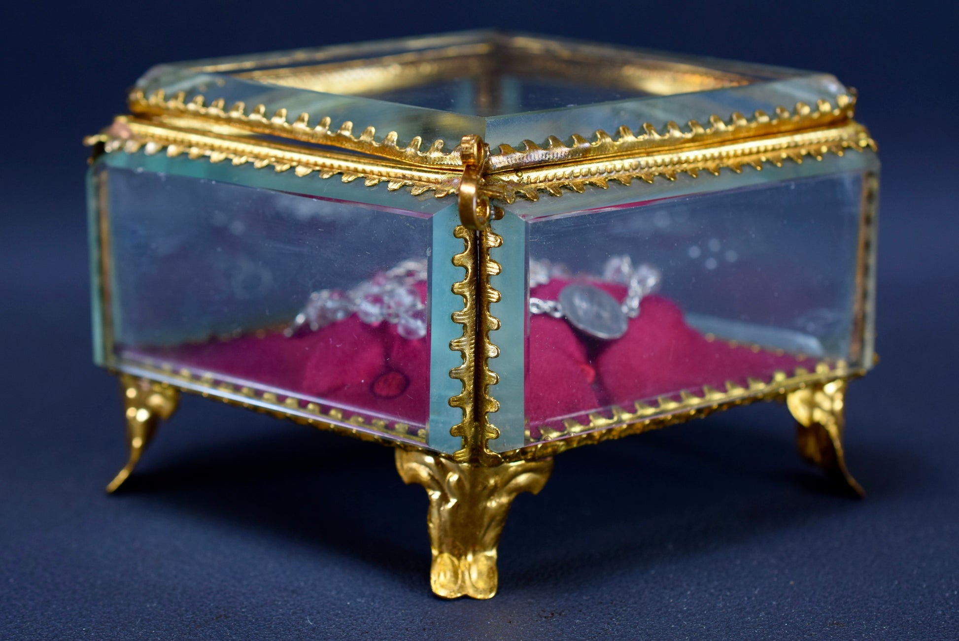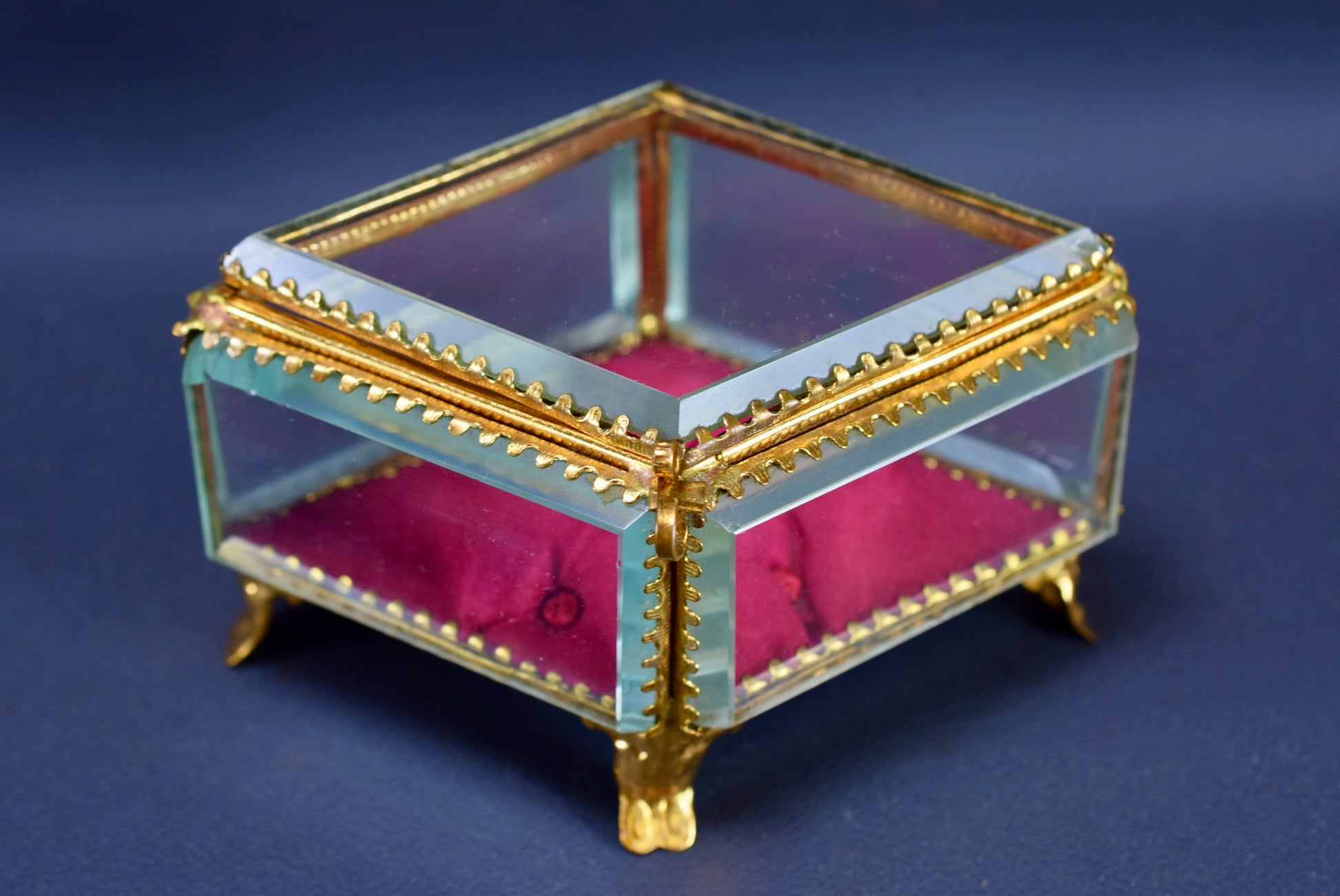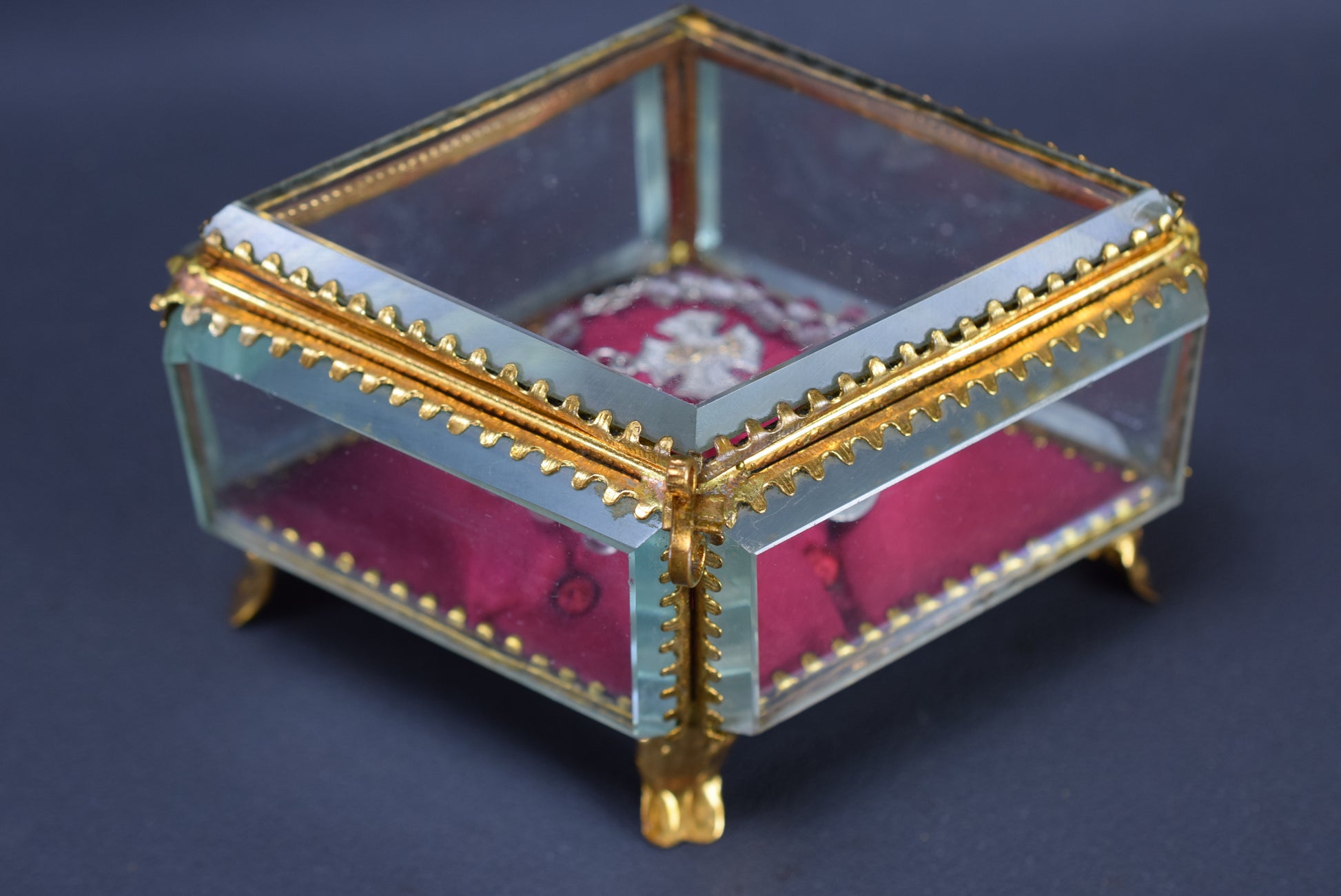 A delightful French diamond shaped wedding casket dating to the late 19th century. This box is mounted on four gilt brass scroll feet. The base of the casket is lined with red fabric cushion. This antique box is perfect for all your jewelry and keepsakes.