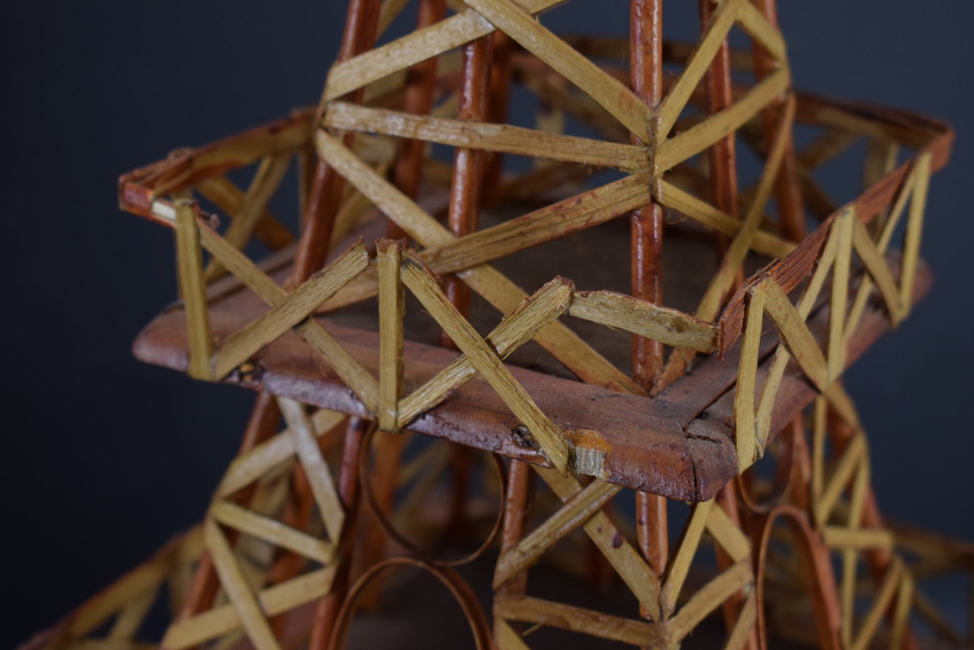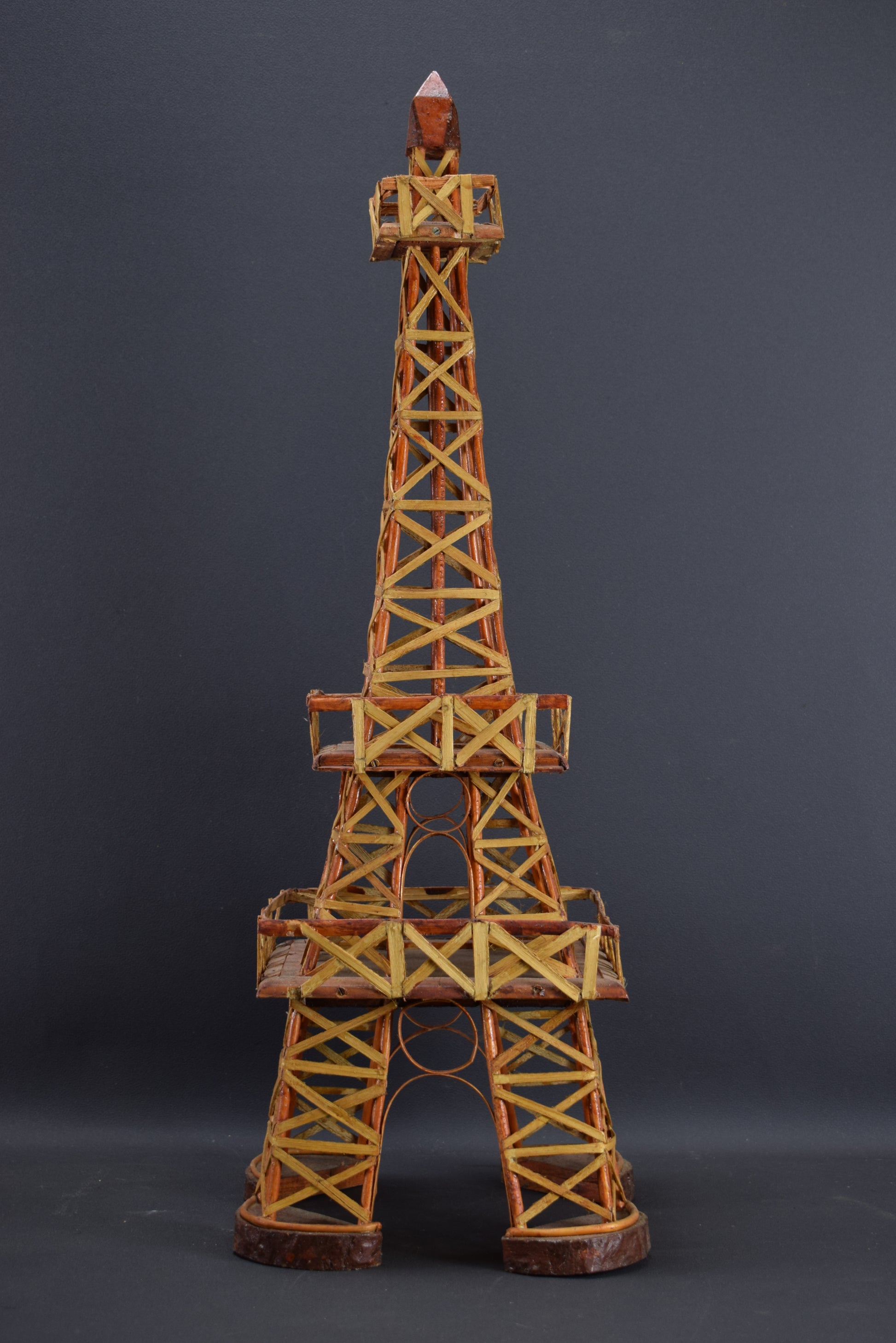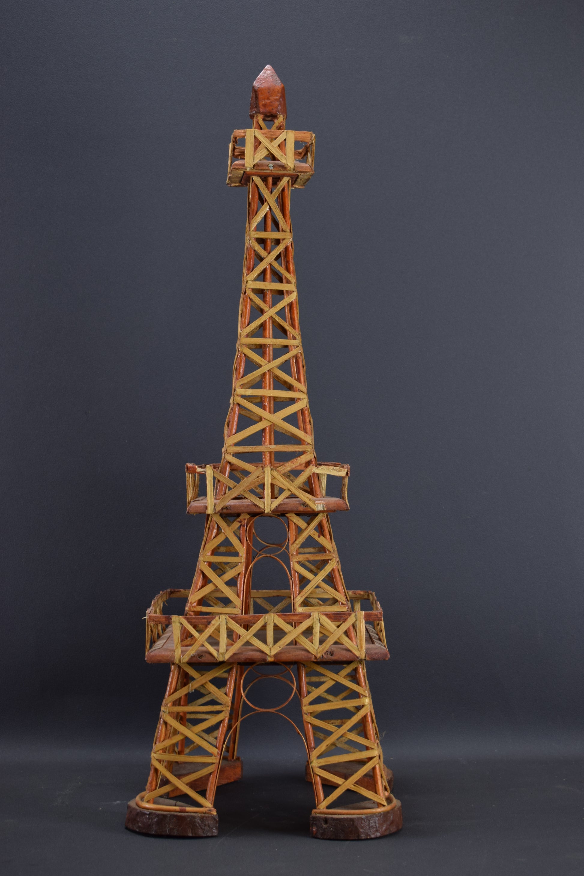 A decorative wooden Eiffel Tower souvenir building sculpture, handmade in the 1960s. The Folk Art Eiffel Tower has been made from small pieces of wood. Perfect to add a Parisian ambiance in your house and gift idea for all Paris lovers. The Eiffel Tower measures 22 1/2 inches high.