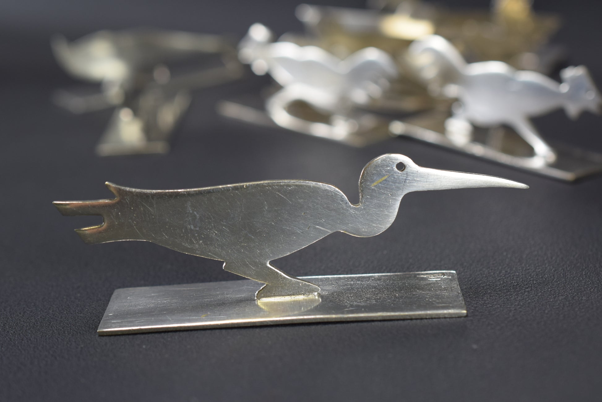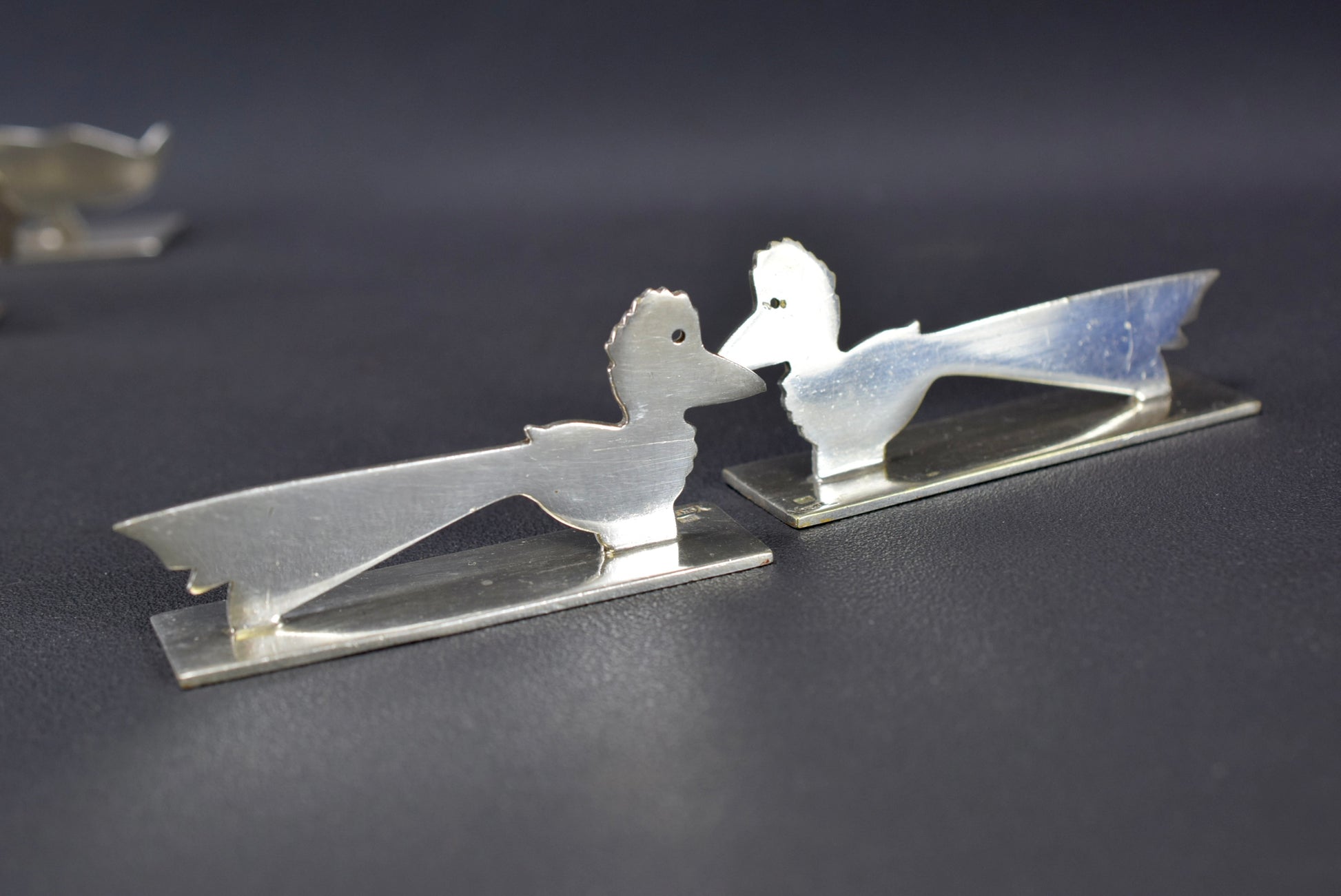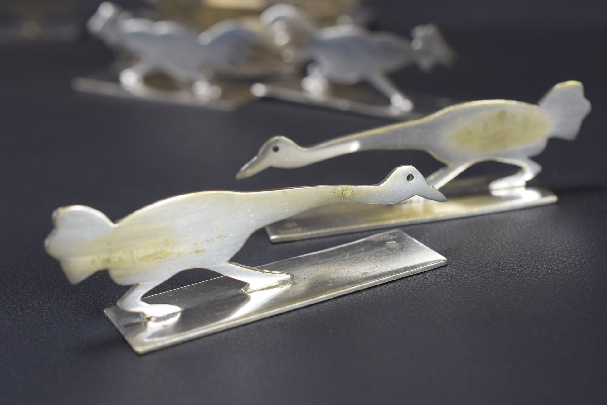 There are two examples of each bird, except for one that is alone (rooster, pelican, goose etc). They have been cleaned but not re-plated.