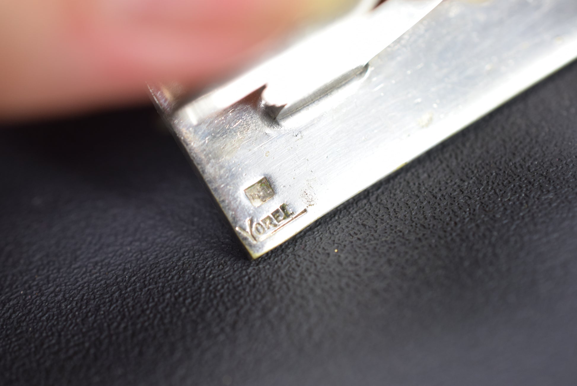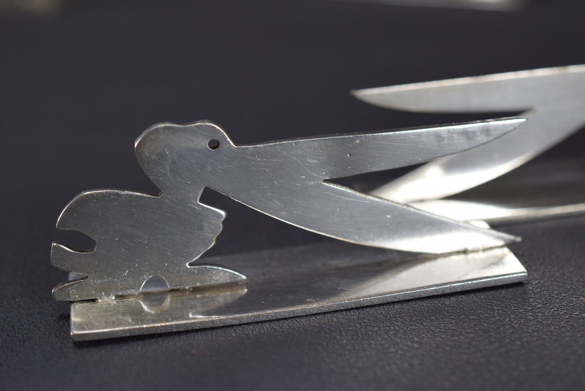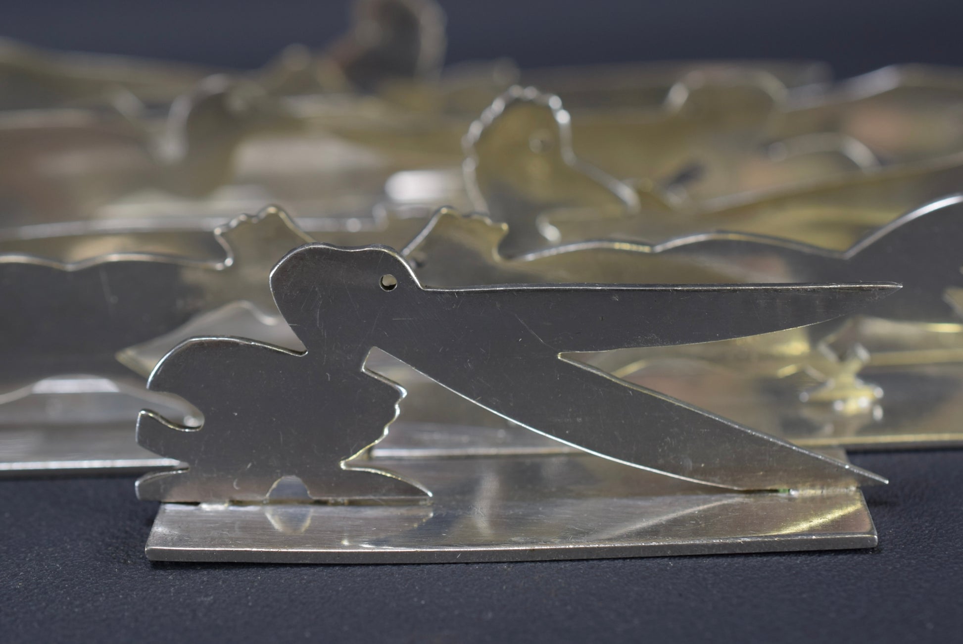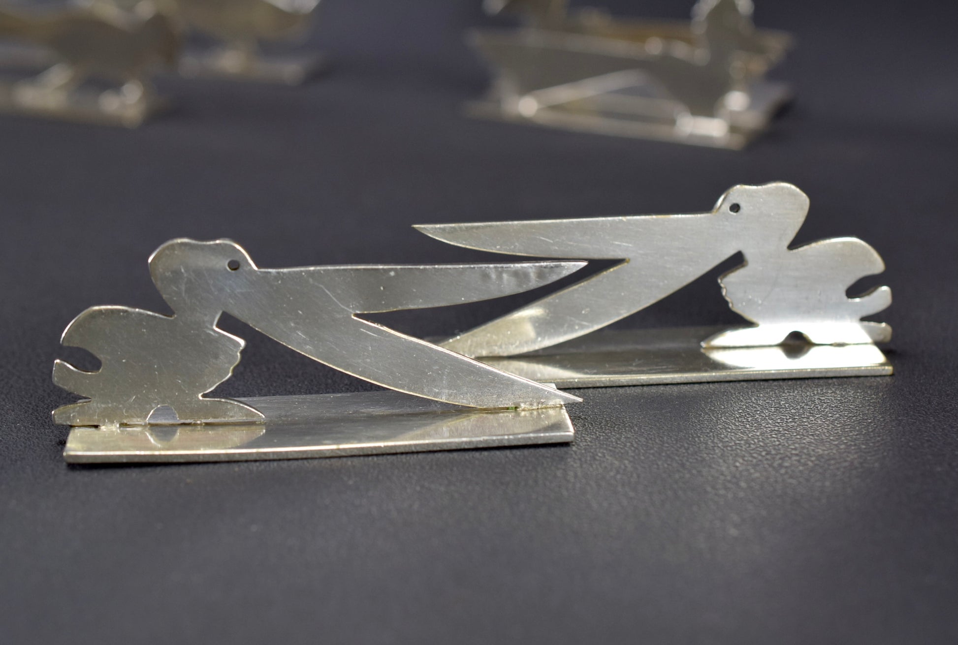 A stunning French set of eleven Art Deco silver plated metal knife rests, circa 1930. They were produced by Yorel and made in France. Abstract design, very modern.
